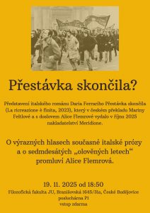 Ve středu 19. 11. 2025 se od 18: 50 uskuteční v rámci Týdne humanitních věd představení italského románu Daria Ferrariho Přestávka skončila (La ricreazione è finita, 2023), který v českém překladu Mariny Feltlové a s doslovem Alice Flemrové vydalo v říjnu 2025 nakladatelství Meridione.